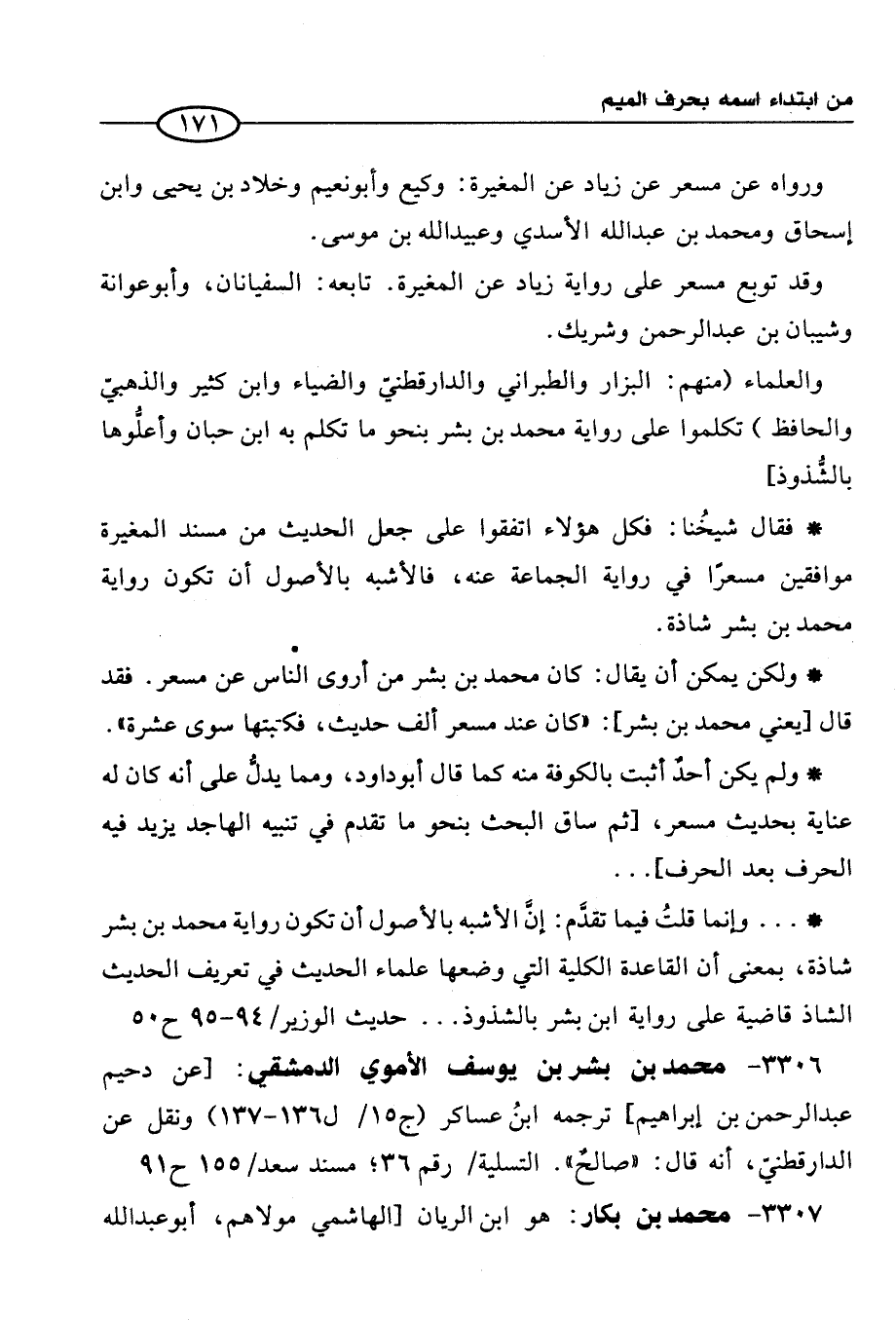 *. . . وإنما قلتُ فيما تقدَّم: إنَّ الأشبه بالأصول أن تكون رواية محمَّد بن بشر شاذة، بمعنى أن القاعدة الكلية التي وضعها علماء الحديث في تعريف الحديث الشاذ قاضية على رواية ابن بشر بالشذوذ. . . حديث الوزير / 94 - 95 ح 50