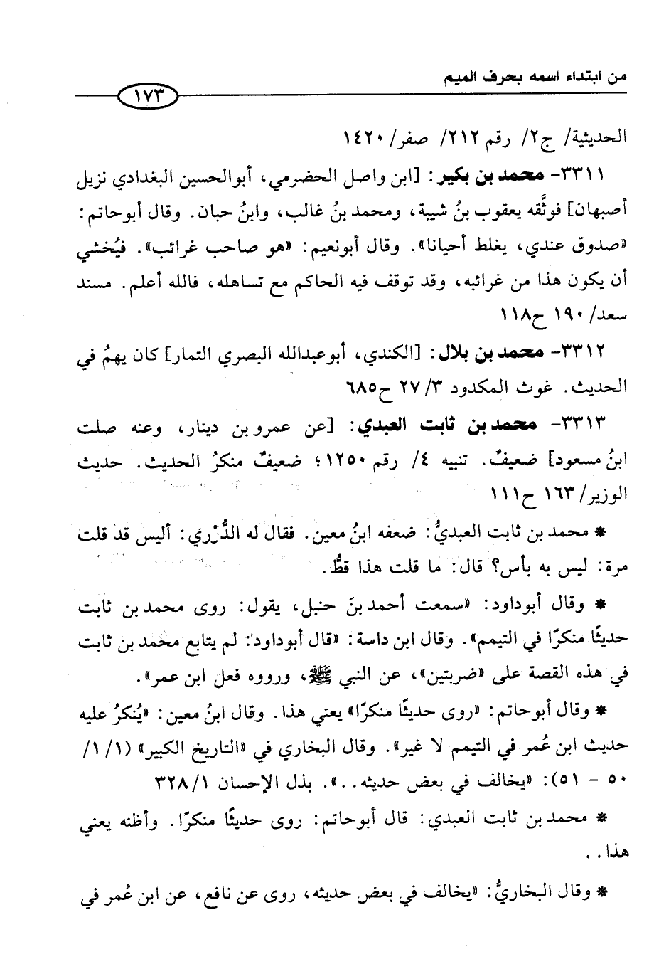 3311 - محمَّد بن بكير: [ابن واصل الحضرمي، أبو الحسين البغدادي نزيل أصبهان] فوثَّقه يعقوب بنُ شيبة، ومحمد بنُ غالب، وابنُ حبان. وقال أبو حاتم: "صدوق عندي، يغلط أحيانًا". وقال أبو نعيم: "هو صاحب غرائب". فيُخشي أن يكون هذا من غرائبه، وقد توقف فيه الحاكم مع تساهله، فالله أعلم. مسند سعد/190ح 118