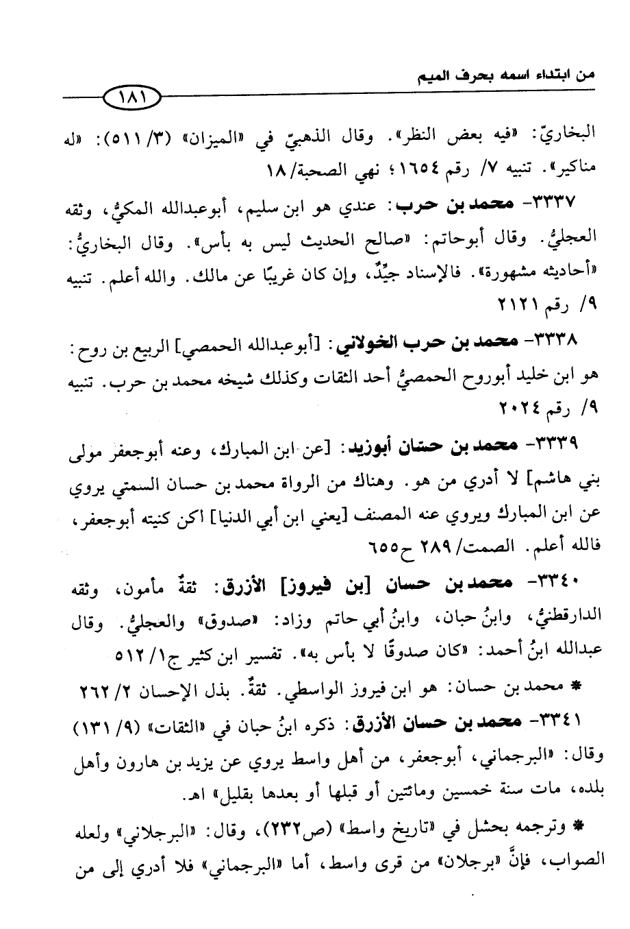 3341 - محمَّد بن حسان الأزرق: ذكره ابنُ حبان في "الثقات" (9/ 131) وقال: "البرجماني، أبو جعفر، من أهل واسط يروي عن يزيد بن هارون وأهل بلده، مات سنة خمسين ومائتين أو قبلها أو بعدها بقليل" اهـ.