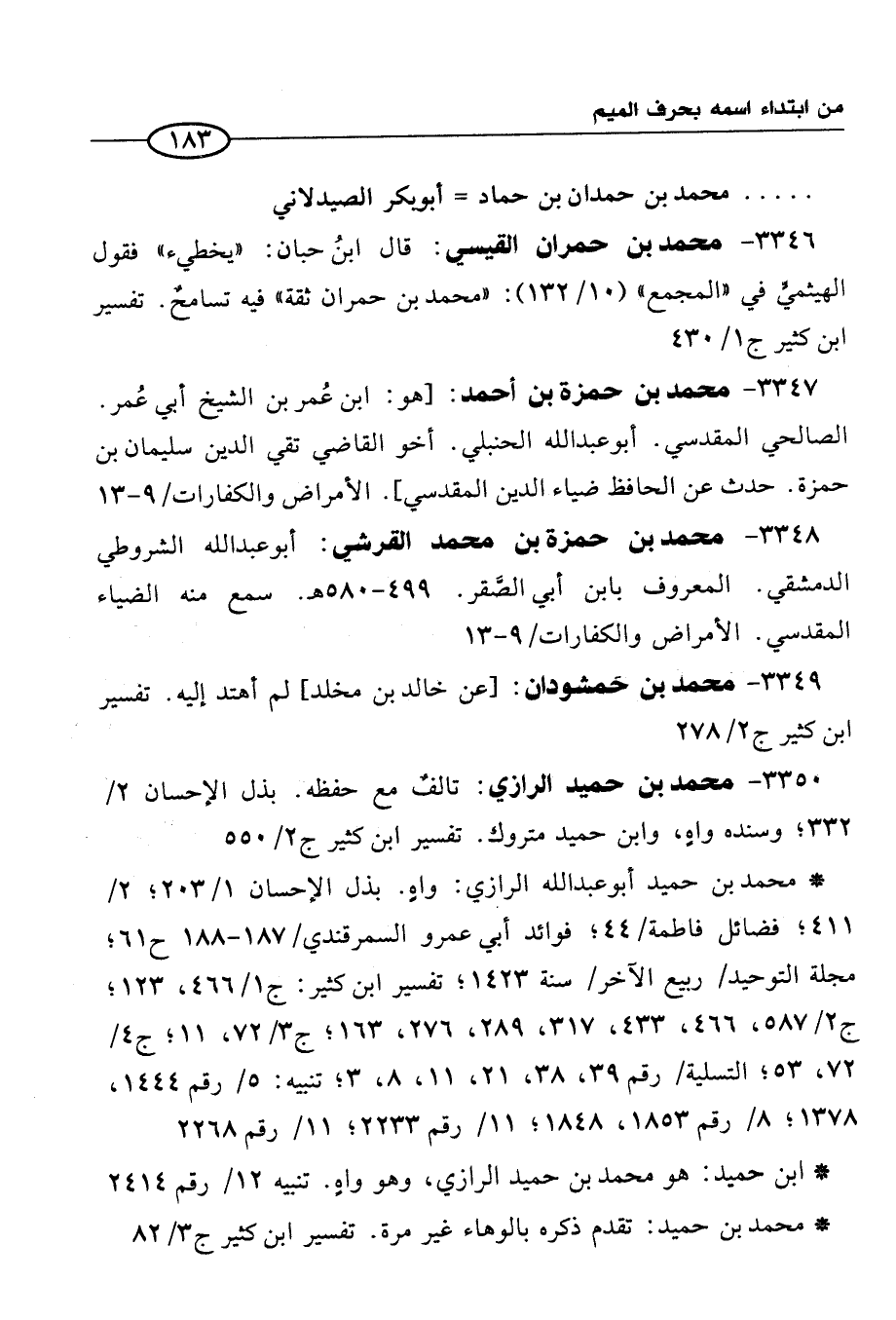 3346 - محمد بن حمران القيسي: قال ابنُ حبان: "يخطيء" فقول الهيثميّ في "المجمع" (10/ 132): "محمد بن حمران ثقة" فيه تسامحٌ. تفسير ابن كثير ج 1/ 430