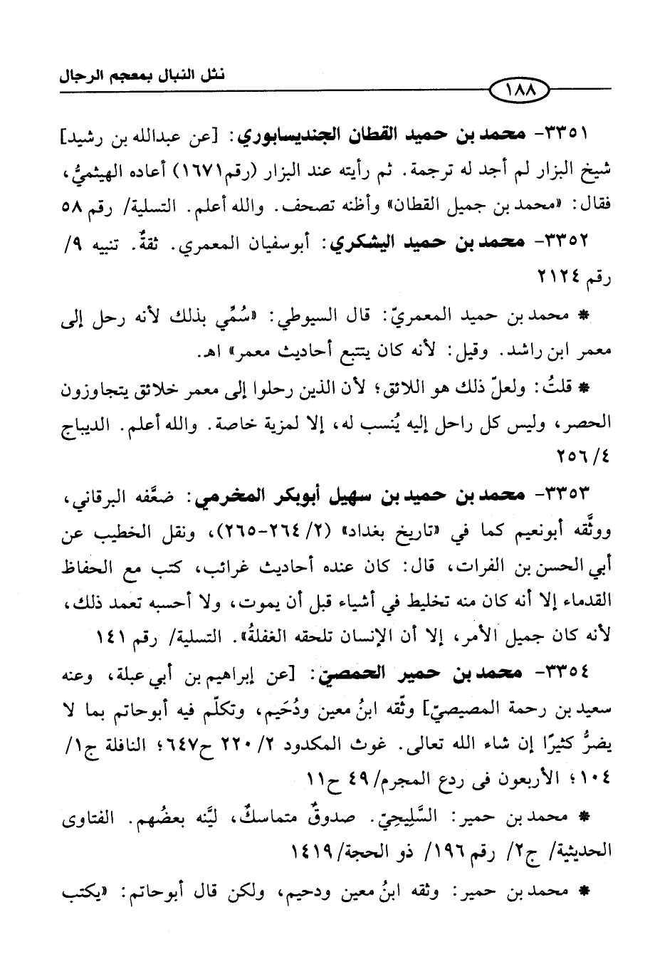 3351 - محمَّد بن حميد القطان الجنديسابوري: [عن عبد الله بن رشيد] شيخ البزار لم أجد له ترجمة. ثم رأيتَه عند البزار (رقم 1671) أعاده الهيثميُّ، فقال: "محمَّد بن جميل القطان" وأظنه تصحف. والله أعلم. التسلية/ رقم 58