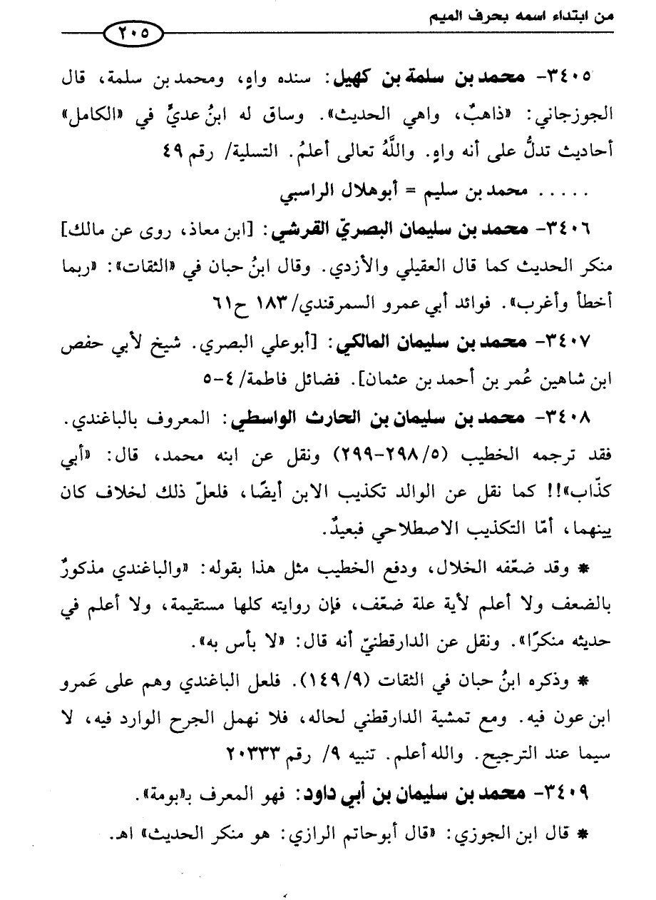 3408 - محمد بن سليمان بن الحارث الواسطي: المعروف بالباغندي. فقد ترجمه الخطيب (5/ 298 - 299) ونقل عن ابنه محمد، قال: "أبي كذّاب"!! كما نقل عن الوالد تكذيب الابن أيضًا، فلعلّ ذلك لخلاف كان بينهما، أمّا التكذيب الاصطلاحي فبعيدٌ.