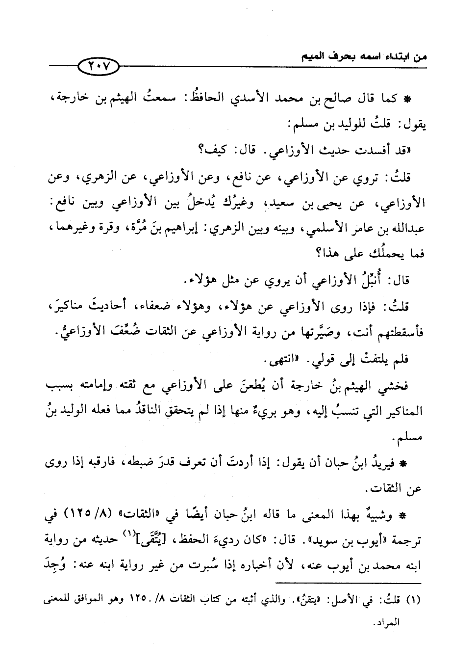 فخشي الهيثم بنُ خارجة أن يُطعنَ على الأوزاعي مع ثقته وإمامته بسبب المناكير التي تنسبُ إليه، وهو بريءٌ منها إذا لم يتحقق الناقدُ مما فعله الوليد بنُ مسلم.