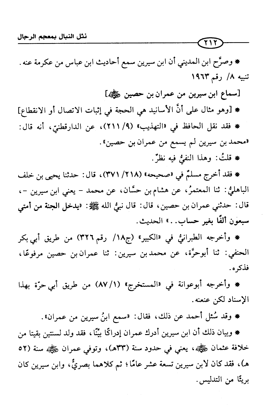 * وبيان ذلك أن ابن سيرين أدرك عمران إدراكًا بيِّنًا، فقد ولد لسنتين بقيتا من خلافة عثمان -رَضِيَ الله عَنْهُ-، يعني في حدود سنة (33 هـ)، وتوفي عمران -رَضِيَ الله عَنْهُ- سنة (52 هـ)، فقد كان لابن سيرين تسعة عشر عامًا؛ ثم كلاهما بصريٌّ، وابن سيرين كان بريئًا من التدليس.