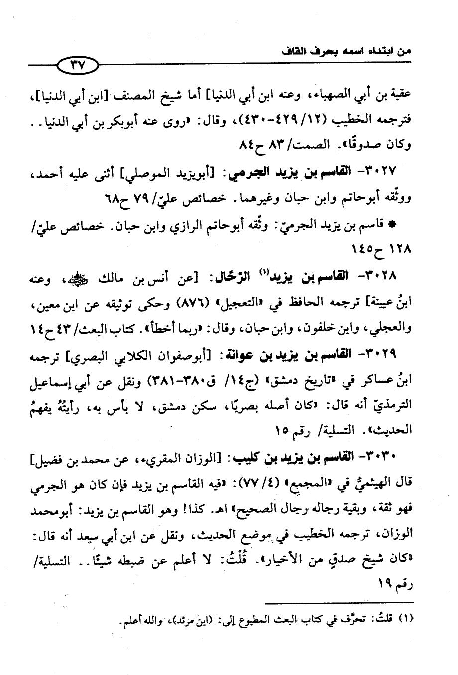 3030 - القاسم بن يزيد بن كليب: [الوزان المقريء، عن محمَّد بن فضيل] قال الهيثميُّ في "المجمع" (4/ 77) "فيه القاسم بن يزيد فإن كان هو الجرمي فهو ثقة، وبقية رجاله رجال الصحيح" اهـ. كذا! وهو القاسم بن يزيد: أبو محمد الوزان، ترجمه الخطيب في موضع الحديث، ونقل عن ابن أبي سعد أنه قال: "كان شيخ صدقٍ من الأخيار". قُلْتُ: لا أعلم عن ضبطه شيئًا. . التسلية/ رقم 19