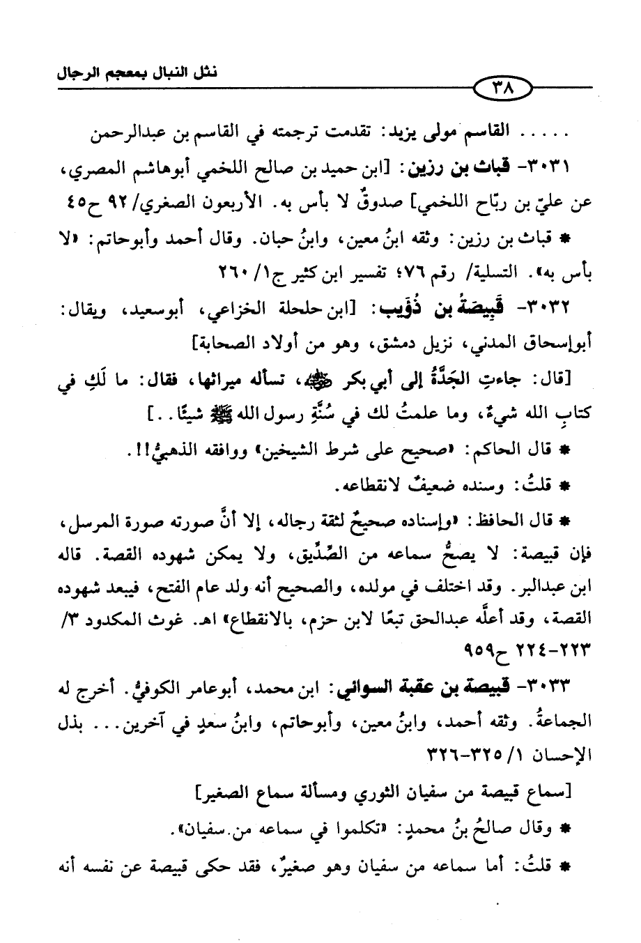 3033 - قبيصة بن عقبة السوائي: ابن محمَّد، أبو عامر الكوفيُّ. أخرج له الجماعةُ. وثقه أحمد، وابنُ معين، وأبو حاتم، وابنُ سعدٍ في آخرين. . . بذل الإحسان 1/ 325 - 326