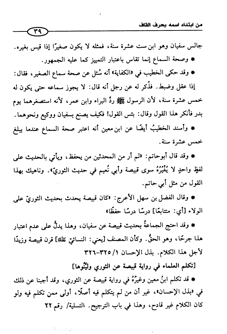 * وقد حكى الخطيب في "الكفاية" أنه سُئل عن صحة سماع الصغير، فقال: إذا عقل وضبط. فذُكر له عن رجل أنه قال: لا يجوز سماعه حتى يكون له خمس عشرة سنة، لأن الرسول -صلى الله عليه وسلم- ردَّ البراء وابن عمر، لأنه استصغرهما يوم بدر فأنكر هذا القول وقال: بئس القول! فكيف يصنع بسفيان ووكيع ونحوهما.