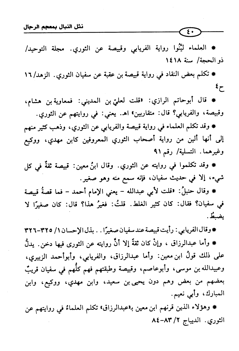 * العلماء ليَّنُوا رواية الفريابي وقييصة عن الثوري. مجلة التوحيد/ ذو الحجة/ سنة 1418