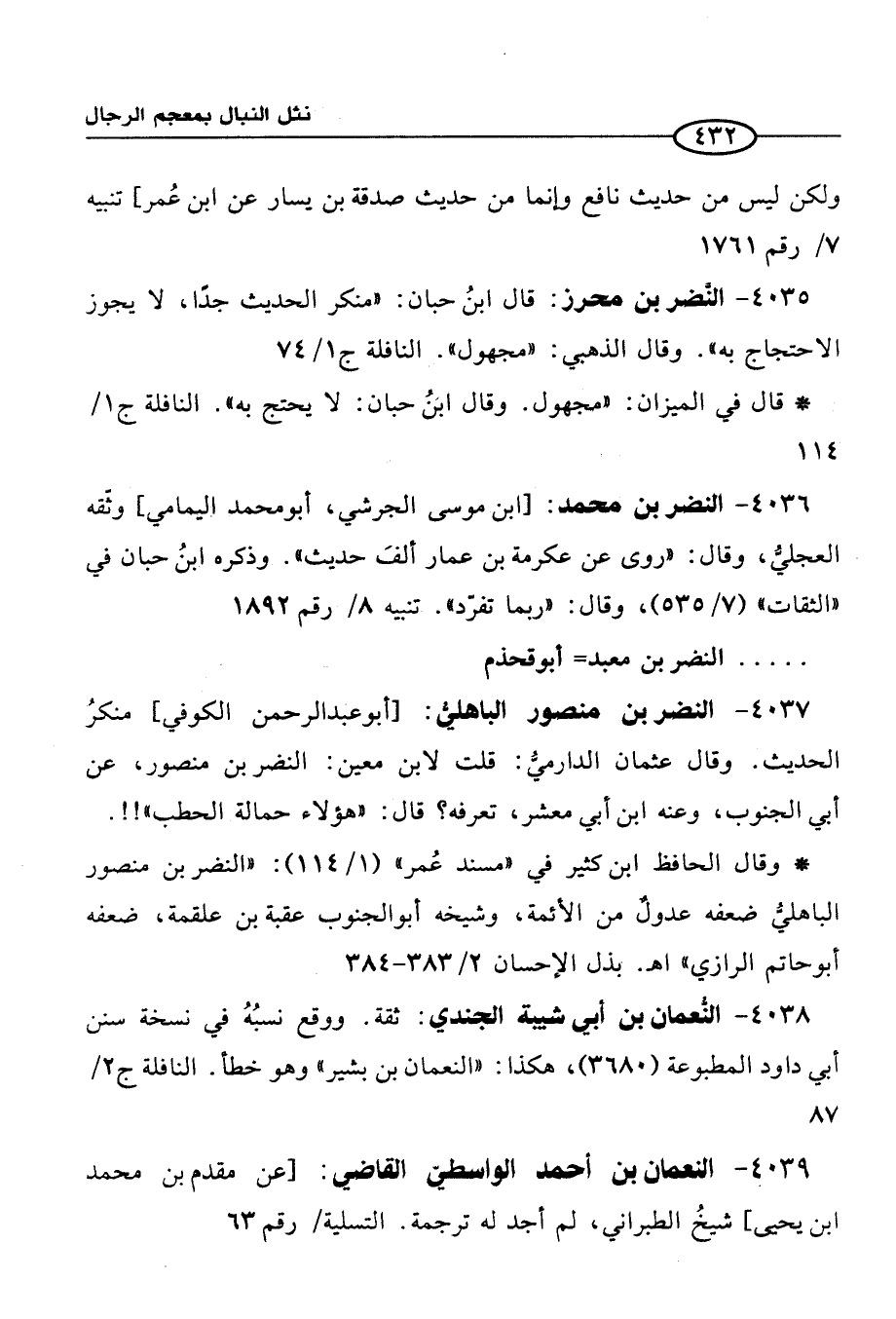 4037 - النَّضر بن منصور الباهلين: [أبو عبد الرحمن الكوفي] منكرُ الحديث. وقال عثمان الدارميُّ: قلت لابن معين: النضر بن منصور، عن أبي الجنوب، وعنه ابن أبي معشر، تعرفه؟ قال: "هؤلاء حمالة الحطب"!!.