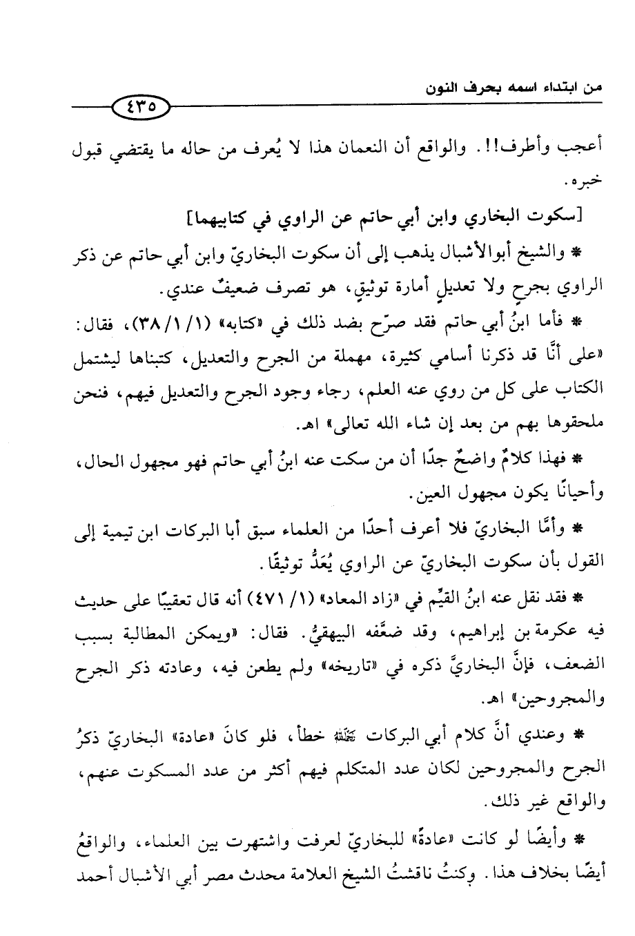 * والشيخ أبو الأشبال يذهب إلى أن سكوت البخاريّ وابن أبي حاتم عن ذكر الراوي بجرحٍ ولا تعديلٍ أمارة توثيقٍ، هو تصرف ضعيفٌ عندي.
