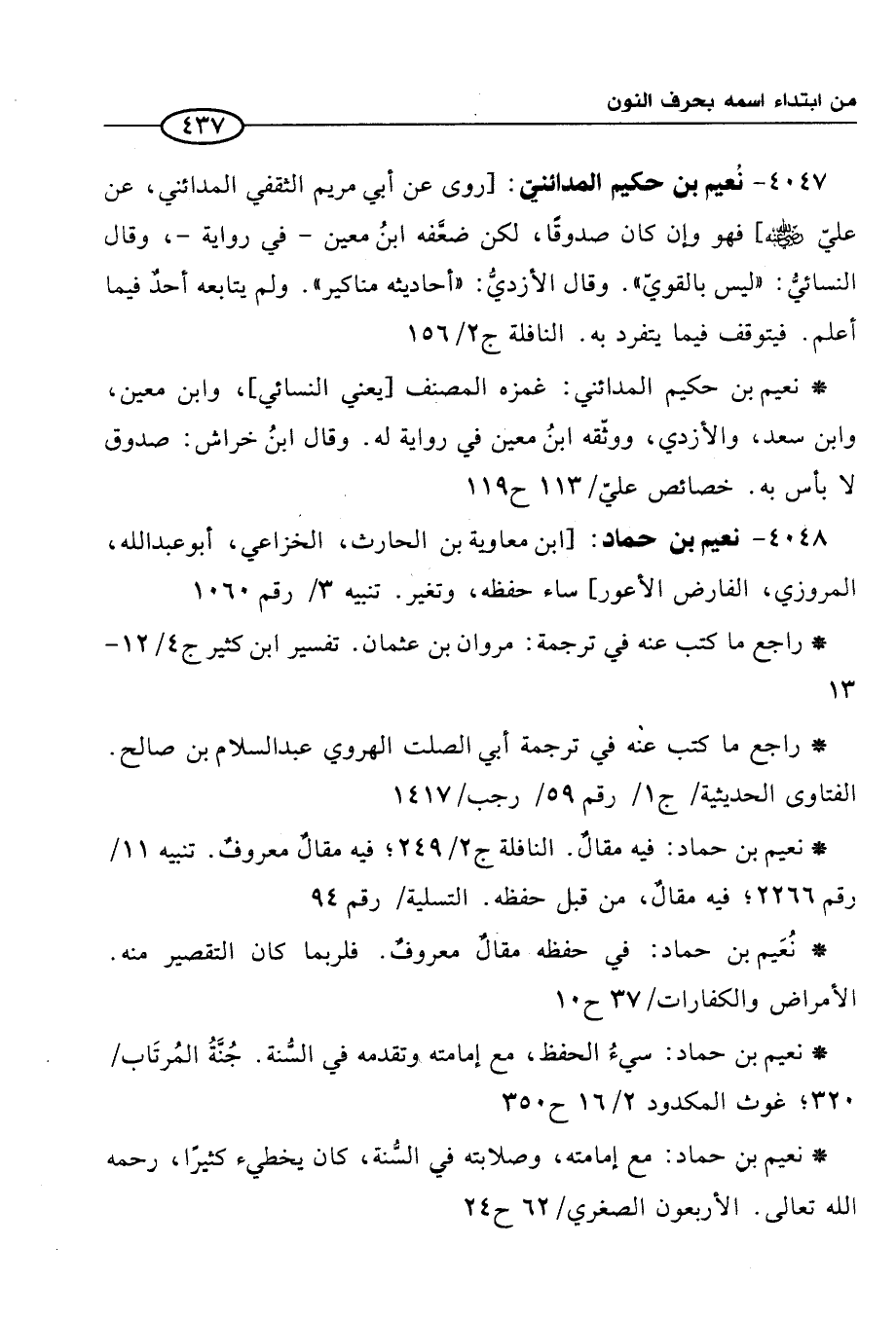 * نعيم بن حماد: فيه مقالٌ. النافلة ج 2/ 249؛ فيه مقالٌ معروفٌ. تنبيه 11/ رقم 2266؛ فيه مقالٌ، من قبل حفظه. التسلية / رقم 94