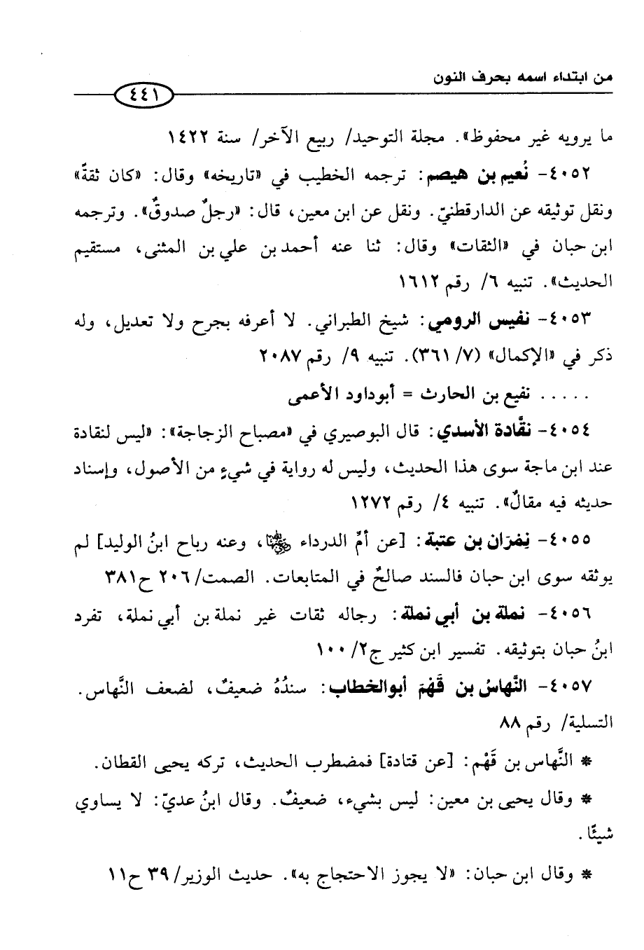 4052 - نُعيم بن هيصم: ترجمه الخطيب في "تاريخه" وقال: "كان ثقةً" ونقل توثيقه عن الدارقطنيّ. ونقل عن ابن معين، قال: "رجلٌ صدوقٌ". وترجمه ابن حبان في "الثقات" وقال: ثنا عنه أحمد بن علي بن المثنى، مستقيم الحديث". تنبيه 6/ رقم 1612