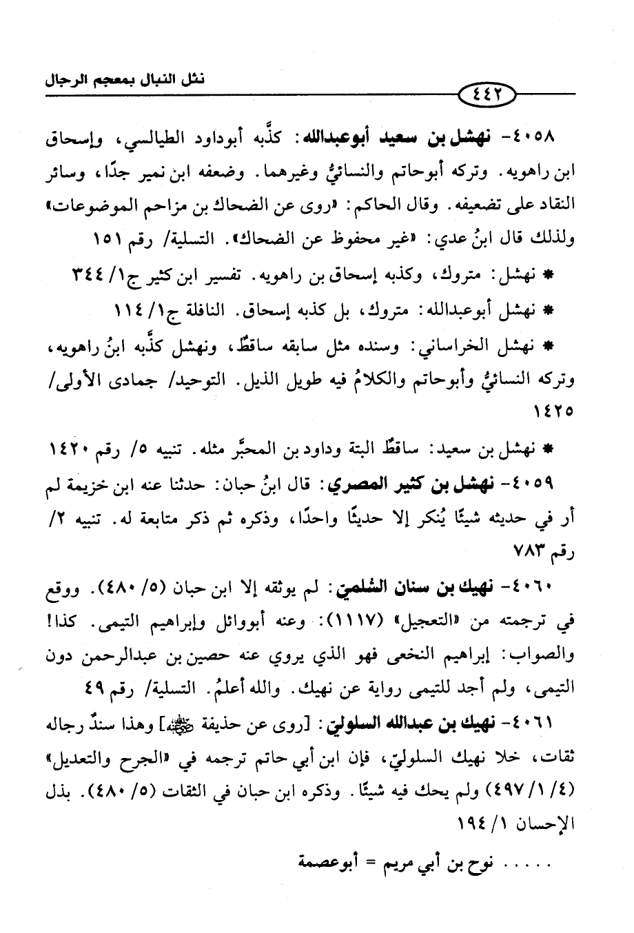4058 - نهشل بن سعيد أبو عبد الله: كذَّبه أبو داود الطيالسي، وإسحاق ابن راهويه. وتركه أبو حاتم والنسائيُّ وغيرهما. وضعفه ابن نمير جدًا، وسائر النقاد على تضعيفه. وقال الحاكم: "روى عن الضحاك بن مزاحم الموضوعات" ولذلك قال ابنُ عدي: "غير محفوظ عن الضحاك". التسلية / رقم 151