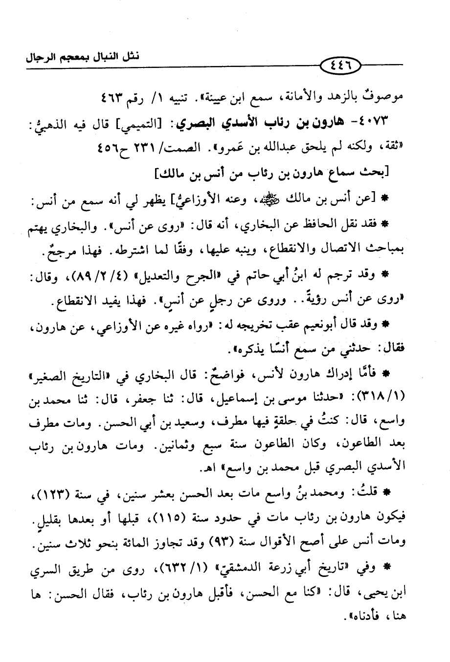 4073 - هارون بن رئاب الأسدي البصري: [التميمي] قال فيه الذهبيُّ: "ثقة، ولكنه لم يلحق عبد الله بن عَمرو". الصمت/ 231 ح 456