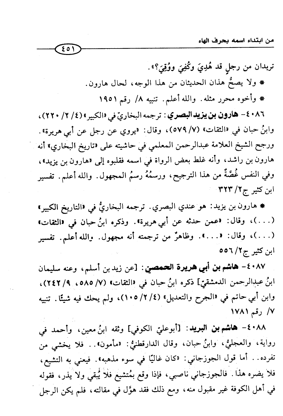 4086 - هارون بن يزيد البصري: ترجمه البخاريٌ في "الكبير" (4/ 2/ 220)، وابنُ حبان في "الثقات" (7/ 579)، وقال: "يروي عن رجل عن أبي هريرة". ورجح الشيخ العلامة عبد الرحمن المعلمي في حاشيته على "تاريخ البخاري" أنه هارون بن راشد، وأنه غلط بعض الرواة في اسمه فقلبوه إلى "هارون بن يزيد"، وفي النفس غُصَّةٌ من هذا الترجيح، ورسمُهُ رسمُ المجهول. والله أعلم. تفسير ابن كثير ج 2/ 323