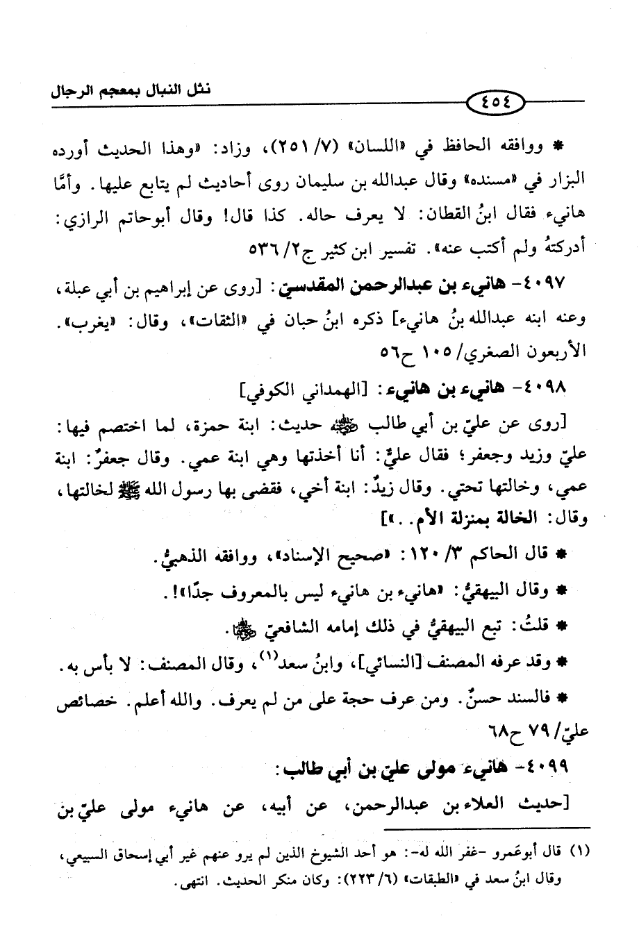 4097 - هانيء بن عبد الرحمن المقدسيّ: [روى عن إبراهيم بن أبي عبلة، وعنه ابنه عبد الله بنُ هانيء] ذكره ابنُ حبان في (الثقات)، وقال: "يغرب". الأربعون الصغري/ 105 ح 56