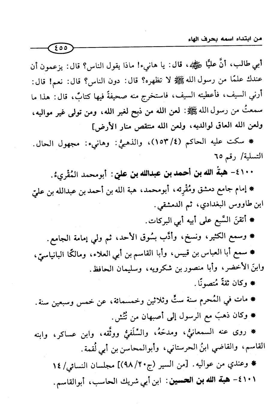 أبي طالب، أنَّ عليًّا -رَضِيَ الله عَنْهُ-، قال: يا هانيء! ماذا يقول الناس؟ قال: يزعمون أن عندك علمًا من رسول الله -صلى الله عليه وسلم- لا تظهره؟ قال: دون الناس؟ قال: نعم! قال: أرني السيف، فأعطيته السيف، فاستخرج منه صحيفةً فيها كتابٌ، قال: هذا ما سمعتُ من رسول الله -صلى الله عليه وسلم-: لعن الله من ذبح لغير الله، ومن تولى غير مواليه، ولعن الله العاق لوالديه، ولعن الله منتقص منار الأرض]
