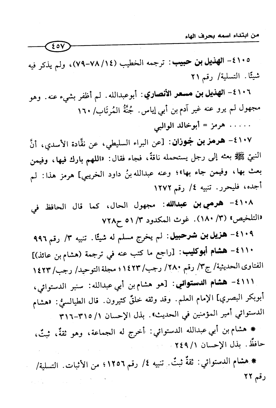 4107 - هرمز بن جُوزان: [عن البراء السليطي، عن نقَّادة الأسدي، أنَّ النبيّ -صلى الله عليه وسلم- بعثه إلى رجل يستحمله ناقةً، فجاء فقال: "اللهم بارك فيها، وفيمن بعث بها، وفيمن جاء بها"؛ وعنه عبد الله بنُ داود الخريبي] هرمز هذا: لم أجده، فليحرر. تنبيه 4/ رقم 1272