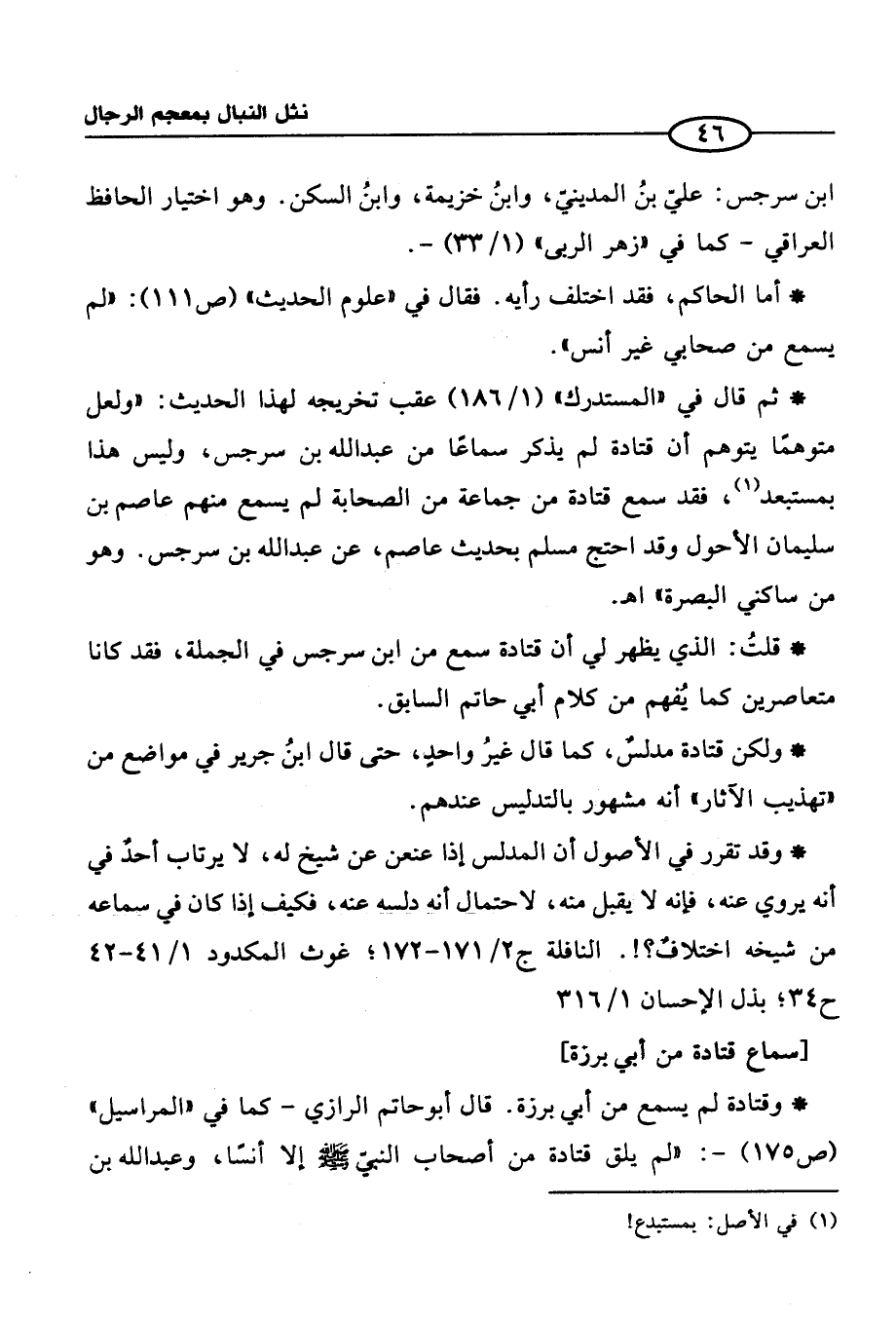 * ثم قال في "المستدرك" (1/ 186) عقب تخريجه لهذا الحديث: "ولعل متوهمًا يتوهم أن قتادة لم يذكر سماعًا من عبد الله بن سرجس، وليس هذا بمستبعد (1)، فقد سمع قتادة من جماعة من الصحابة لم يسمع منهم عاصم بن سليمان الأحول وقد احتج مسلم بحديث عاصم، عن عبد الله بن سرجس. وهو من ساكني البصرة" اهـ.