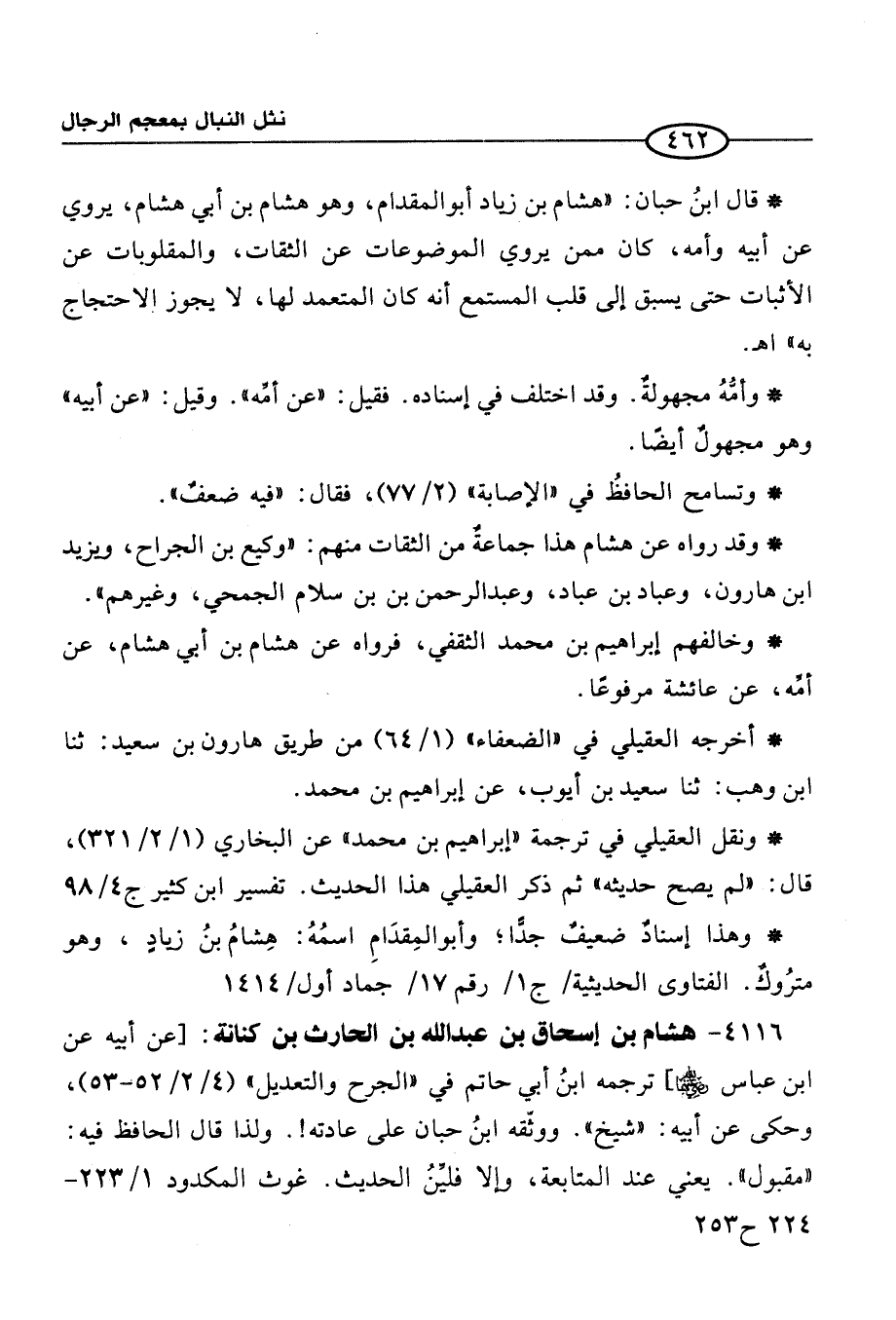 4116 - هشام بن إسحاق بن عبد الله بن الحارث بن كنانة: [عن أبيه عن ابن عباس رضي الله عنهما] ترجمه ابنُ أبي حاتم في "الجرح والتعديل" (4/ 2/ 52 - 53)، وحكى عن أبيه: "شيخ". ووثّقه ابنُ حبان على عادته!. ولذا قال الحافظ فيه: "مقبول". يعني عند المتابعة، وإلا فليِّنُ الحديث. غوث المكدود 1/ 223 - 224 ح 253
