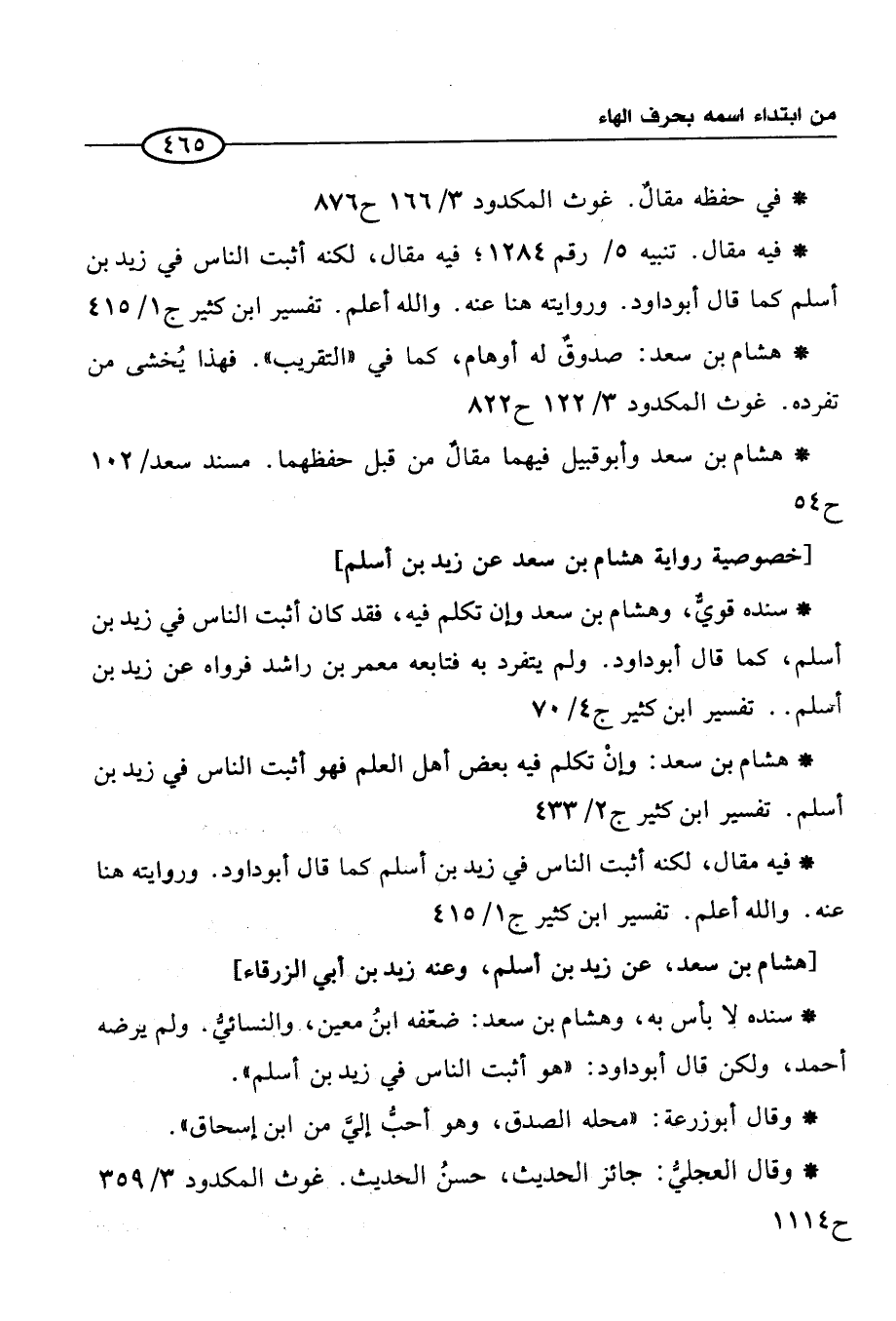* هشام بن سعد: وإنْ تكلم فيه بعض أهل العلم فهو أثبت الناس في زيد بن أسلم. تفسير ابن كثير ج 2/ 433