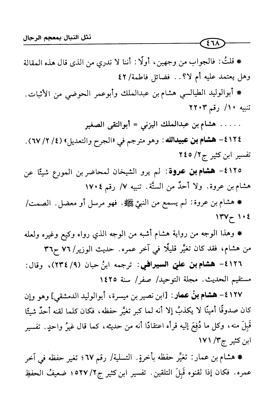 4126 - هشام بن عليّ السيرافي: ترجمه ابنُ حبان (9/ 234)، وقال: مستقيم الحديث. مجلة التوحيد / صفر/ سنة 1425