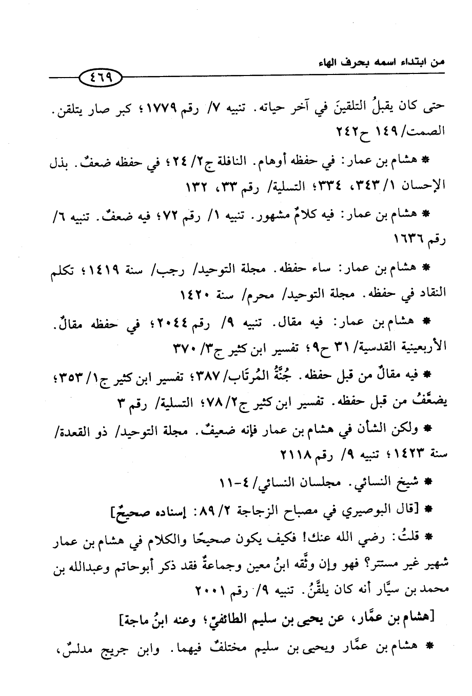 * هشام بن عمار: ساء حفظه. مجلة التوحيد / رجب/ سنة 1419؛ تكلم النقاد في حفظه. مجلة التوحيد / محرم / سنة 1420