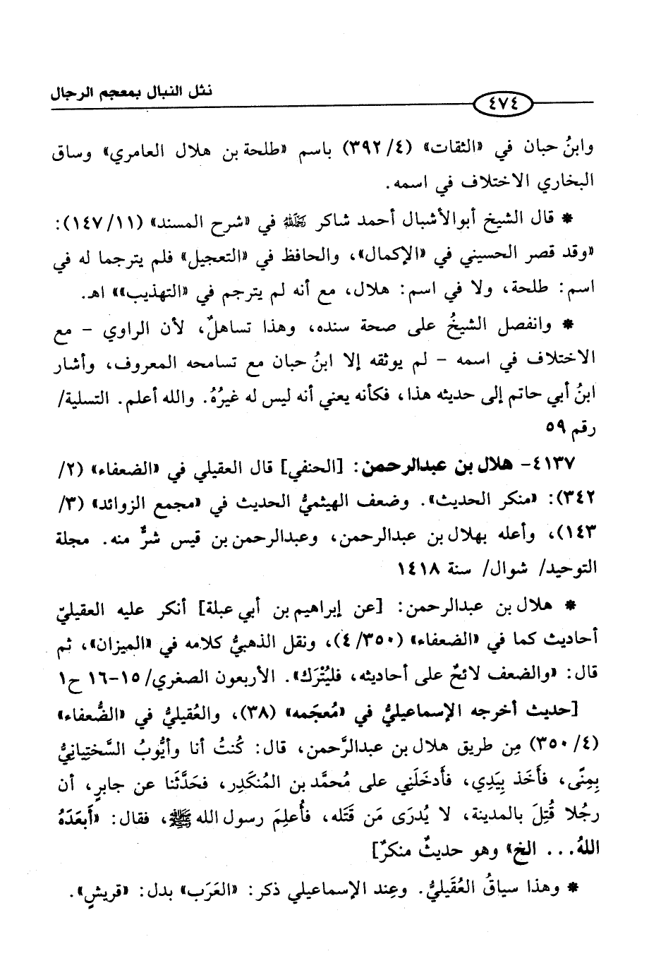 * هلال بن عبد الرحمن: [عن إبراهيم بن أبي عبلة] أنكر عليه العقيليّ أحاديث كما في "الضعفاء" (350/ 4)، ونقل الذهبيُّ كلامه في "الميزان"، ثم قال: "والضعف لائحٌ على أحاديثه، فليُتْرَك). الأربعون الصغري / 15 - 16 ح1