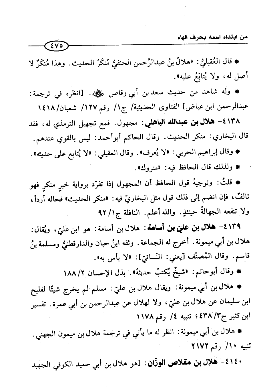 4139 - هلال بن عليّ بن أسامة: هلال بن أسامة: هو ابن عليّ، ويقال: هلال بن أبي ميمونة. أخرج له الجماعة. وثقه ابنُ حبان والدارقطنيُّ ومسلمة بنُ قاسم. وقال المُصنّف [يعني: النّسائيّ] "لا بأس به".