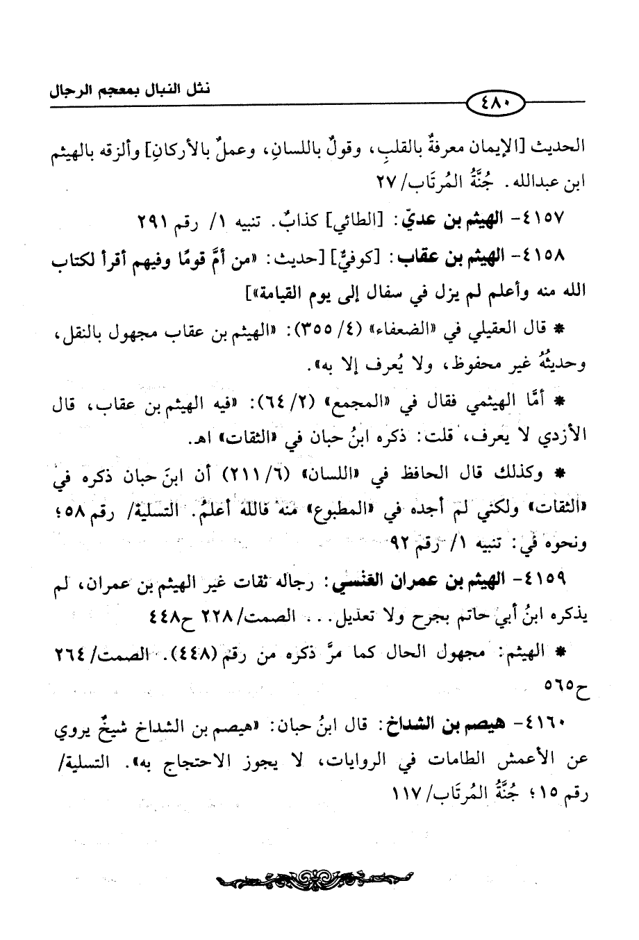 4160 - هيصم بن الشداخ: قال ابنُ حبان: "هيصم بن الشداخ شيخٌ يروي عن الأعمش الطامات في الروايات، لا يجوز الاحتجاج به". التسلية / رقم 15؛ جُنَّةُ المُرتَاب / 117