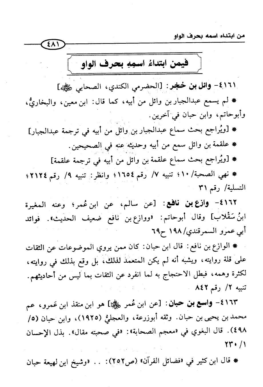 4163 - واسع بن حبان: [عن ابن عُمر رضي الله عنهما] هو ابن منقذ ابن عَمرو، عم محمَّد بن يحيى بن حبان. وثقه أبو زرعة، والعجليُّ (1925)، وابن حبان (5/ 498). قال البغوي في "معجم الصحابة": "في صحبتة مقال". بذل الإحسان 1/ 230