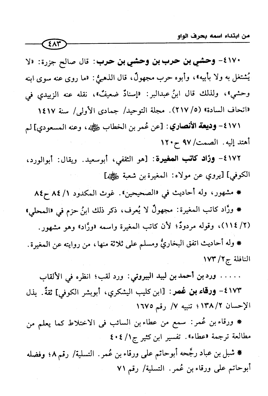 * ورَّاد كاتب المغيرة: مجهولٌ لا يُعرف، ذكر ذلك ابنُ حزم في "المحلي" (2/ 114)، وقوله مردودٌ؛ لأن كاتب المغيرة واسمه "ورَّاد" وهو مشهور.