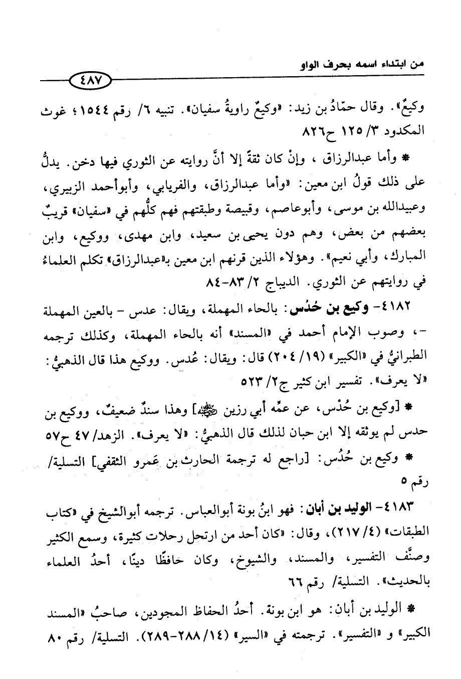 4182 - وكيع بن حُدُس: بالحاء المهملة، ويقال: عدس -بالعين المهملة-، وصوب الإِمام أحمد في "المسند" أنه بالحاء المهملة، وكذلك ترجمه الطبرانيُّ في "الكبير" (19/ 204) قال: ويقال: عُدس. ووكيع هذا قال الذهبيُّ: "لا يعرف". تفسير ابن كثير ج 2/ 523