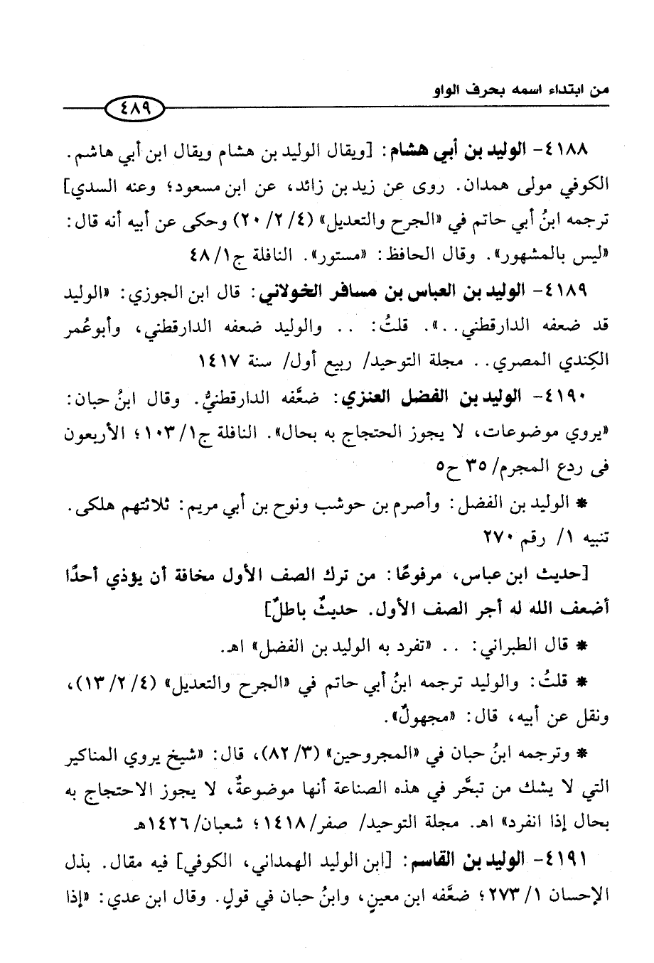 4189 - الوليد بن العباس بن مسافر الخولاني: قال ابن الجوزي: "الوليد قد ضعفه الدارقطني. .". قلتُ:. . والوليد ضعفه الدارقطني، وأبو عُمر الكِندي المصري. . مجلة التوحيد / ربيع أول / سنة 1417