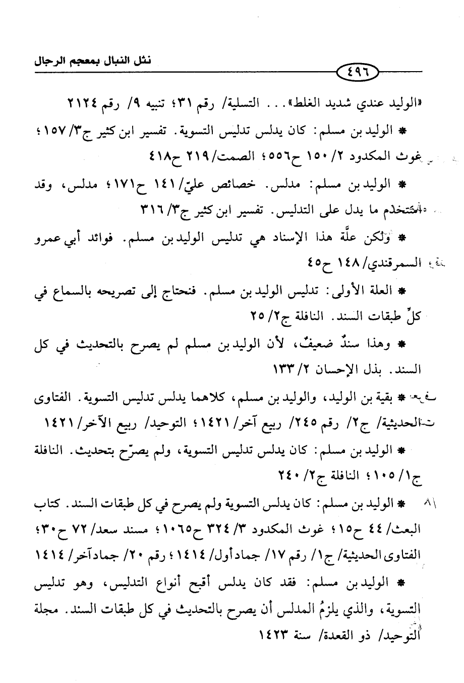 * الوليد بن مسلم: مدلس. خصائص عليّ / 141 ح 171؛ مدلس، وقد استخدم ما يدل على التدليس. تفسير ابن كثير ج 3/ 316