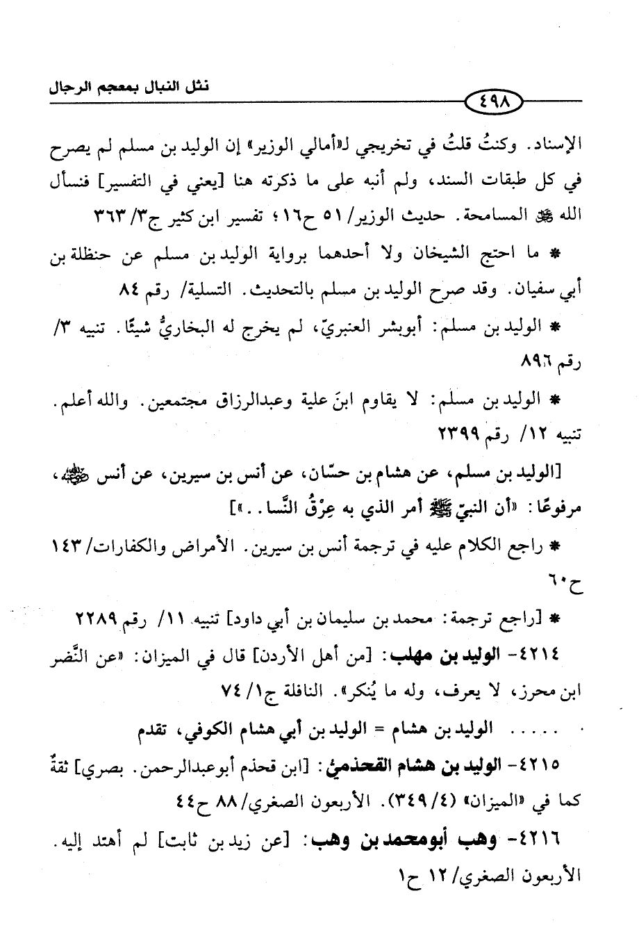 * الوليد بن مسلم: لا يقاوم ابنَ علية وعبد الرزاق مجتمعين. والله أعلم. تنبيه 12/ رقم 2399 [الوليد بن مسلم، عن هشام بن حسّان، عن أنس بن سيرين، عن أنس -رَضِيَ الله عَنْهُ-، مرفوعًا: "أن النبيّ -صلى الله عليه وسلم- أمر الذي به عِرْقُ النَّسا. . "]