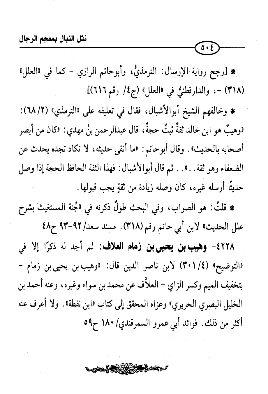 * وخالفهم الشيخ أبو الأشبال، فقال في تعليقه على "الترمذي" (2/ 68): "وهيبٌ هو ابن خالد ثقةٌ ثبتٌ حجةٌ، قال عبد الرحمن بنُ مهدي: "كان من أبصر أصحابه بالحديث". وقال أبو حاتم: "ما أنقى حديثه، لا تكاد تجده يحدث عن الضعفاء وهو ثقة. . ". . ثم قال أبو الأشبال: فهذا الثقة الحافظ الحجة إذا وصل حديثًا أرسله غيره، كان وصله زيادة من ثقةٍ يجب قبولها.