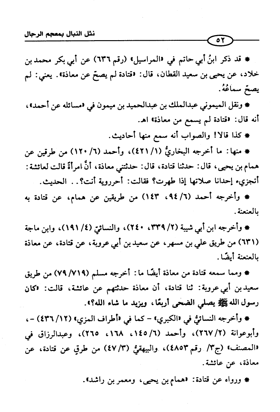 * قد ذكر ابنُ أبي حاتم في "المراسيل" (رقم 636) عن أبي بكر محمد بن خلاد، عن يحيى بن سعيد القطان، قال: "قتادة لم يصحّ عن معاذة". يعني: لم يصحّ سماعُهُ.