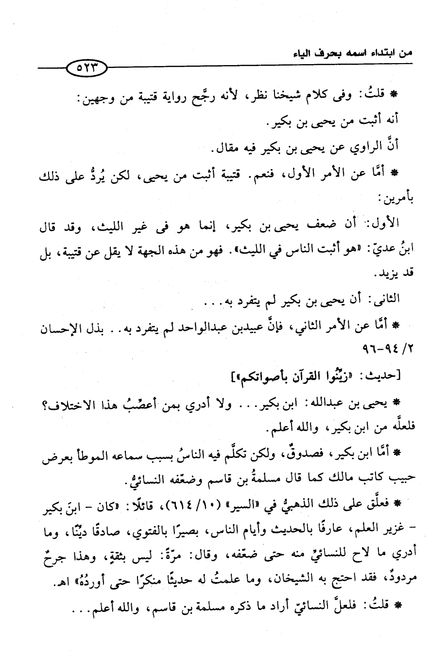 * أمَّا عن الأمر الأول، فنعم. قتيبة أثبت من يحيى، لكن يُردُّ على ذلك بأمرين: الأول: أن ضعف يحيى بن بكير، إنما هو في غير الليث، وقد قال ابنُ عديّ: "هو أثبت الناس في الليث". فهو من هذه الجهة لا يقل عن قتيبة، بل قد يزيد.