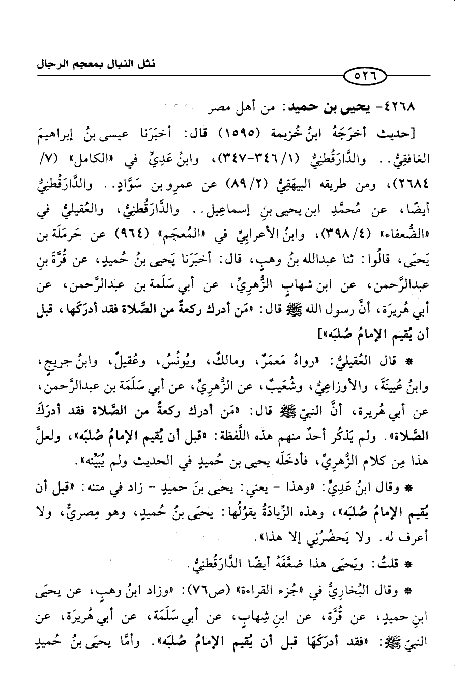 * وقال ابنُ عَدِيٍّ: "وهذا -يعني: يحيى بنَ حميدٍ- زاد في متنه: "قبل أن يُقيم الإمامُ صُلبَه"، وهذه الزِّيادَةُ يقوُلُها: يحيىَ بنُ حُميدٍ، وهو مِصريٌّ، ولا أعرف له. ولا يَحضُرُنِي إلا هذا".