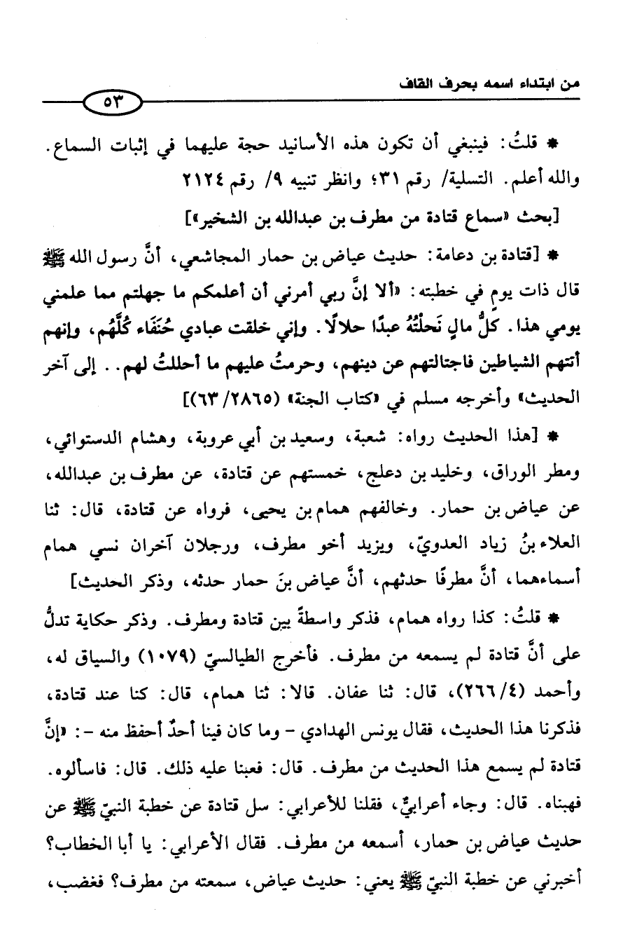 * قلتُ: كذا رواه همام، فذكر واسطةً بين قتادة ومطرف. وذكر حكاية تدلُّ على أنَّ قتادة لم يسمعه من مطرف. فأخرج الطيالسيّ (1079) والسياق له، وأحمد (4/ 266)، قال: ثنا عفان. قالا: ثنا همام، قال: كنا عند قتادة، فذكرنا هذا الحديث، فقال يونس الهدادي -وما كان فينا أحدٌ أحفظ منه-: "إنَّ قتادة لم يسمع هذا الحديث من مطرف. قال: فعبنا عليه ذلك. قال: فسألوه. فهبناه. قال: وجاء أعرابيٌّ، فقلنا للأعرابي: سل قتادة عن خطبة النبيّ -صلى الله عليه وسلم- عن حديث عياض بن حمار، أسمعه من مطرف. فقال الأعرابي: يا أبا الخطاب؟ أخبرني عن خطبة النبيّ -صلى الله عليه وسلم- يعني: حديث عياض، سمعته من مطرف؟ فغضب،