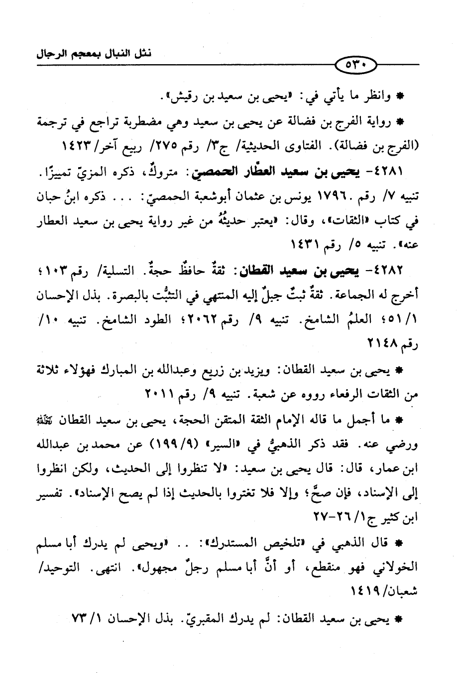 4282 - يحيى بن سعيد القطان: ثقةٌ حافظٌ حجةٌ. التسلية / رقم 103؛ أخرج له الجماعة. ثقةٌ ثبتٌ جبلٌ إليه المنتهي في التثبُّت بالبصرة. بذل الإحسان 1/ 51؛ العلمُ الشامخ. تنبيه 9/ رقم 2062؛ الطود الشامخ. تنبيه 10/ رقم 2148