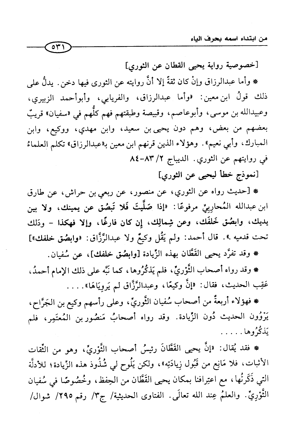 * فقد يُقال: "إنَّ يحيى القَطَّانَ رئيسُ أصحاب الثَّوْريِّ، وهو من الثِّقات الأثبات، فلا مَانِع من قَبُول زِيادَتِه"، ولكن يَلُوح لي شُذُوذ هذه الزِّيادة؛ للأدلَّة التي ذَكَرتُها، مع اعتِرافنا بمكان يحيى القَطَّان من الحِفظ، وخُصوصًا في سُفيان الثَّوْرِيِّ. والعلمُ عِند الله تعالَى. الفتاوى الحديثية / ج 3/ رقم 295/ شوال /