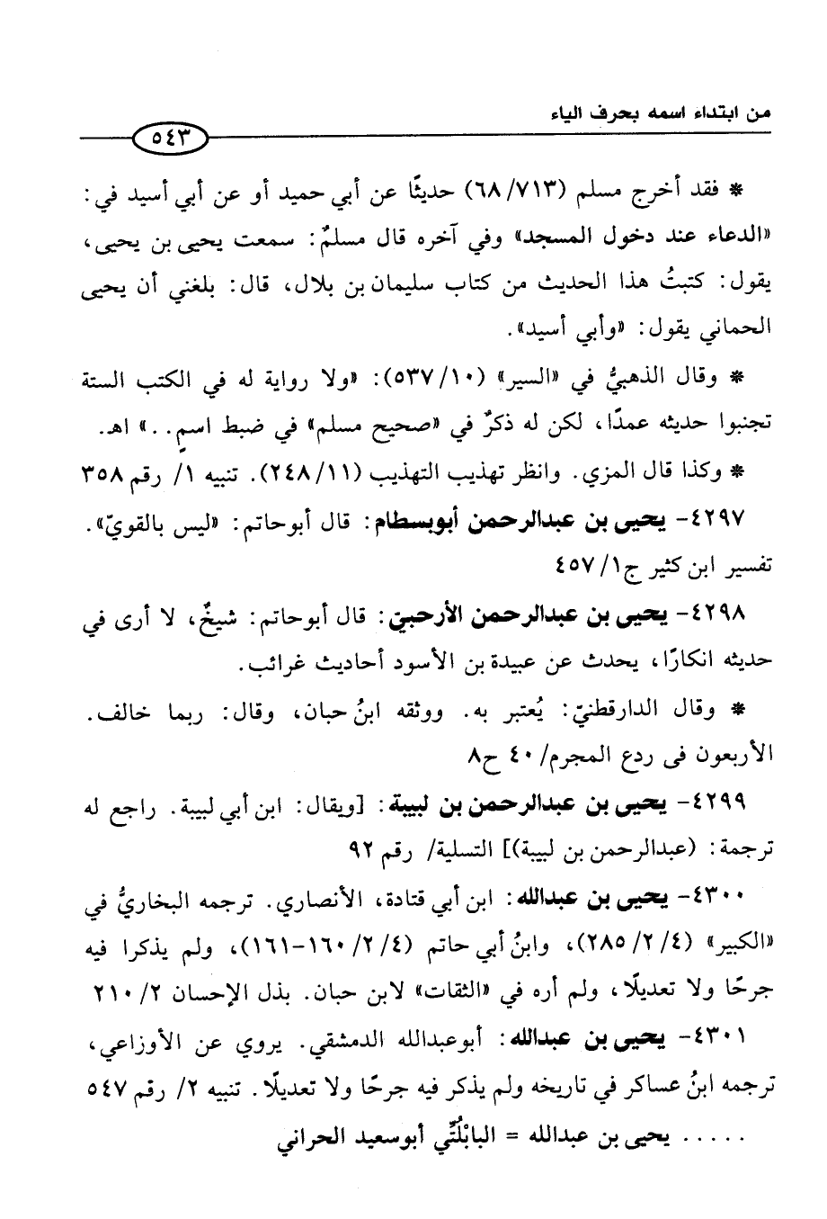 4297 - يحيى بن عبد الرحمن أبو بسطام: قال أبو حاتم: "ليس بالقويّ". تفسير ابن كثير ج 1/ 457