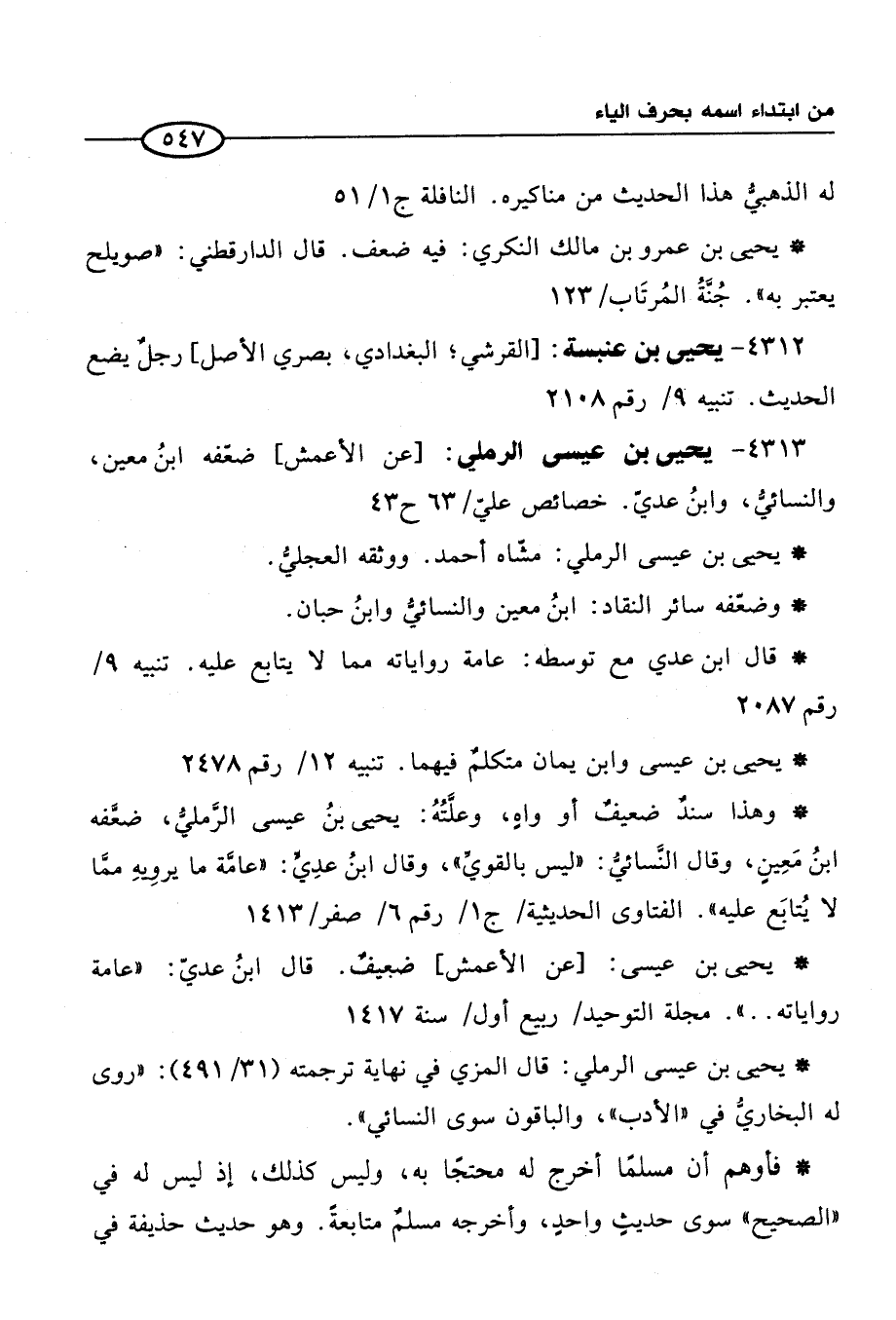 * يحيى بن عيسى: [عن الأعمش] ضعيفٌ. قال ابنُ عديّ: "عامة رواياته. . ". مجلة التوحيد / ربيع أول / سنة 1417