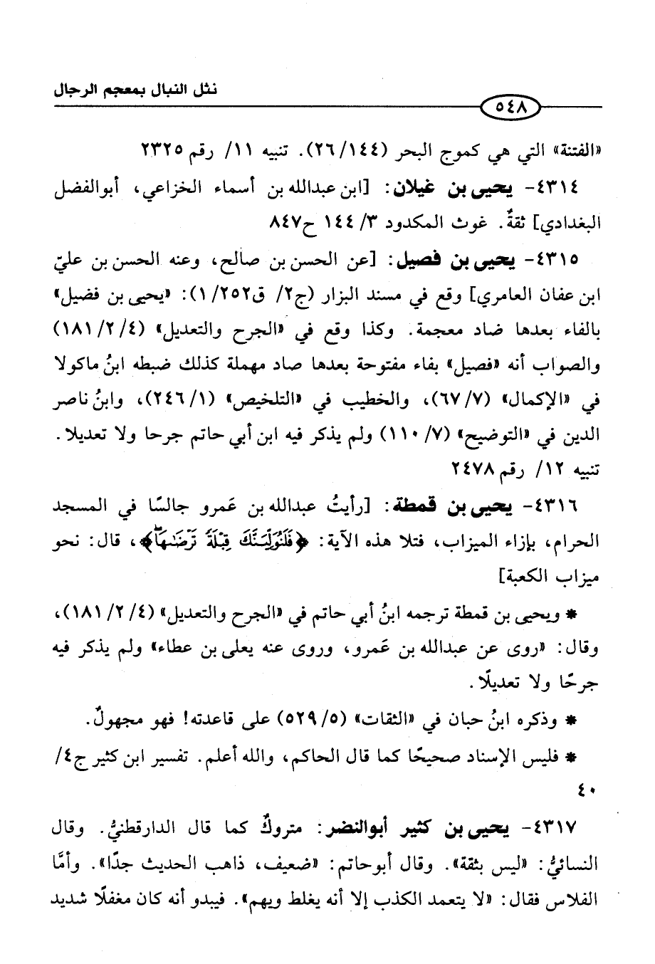 4314 - يحيى بن غيلان: [ابن عبد الله بن أسماء الخزاعي، أبو الفضل البغدادي] ثقةٌ. غوث المكدود 3/ 144 ح 847