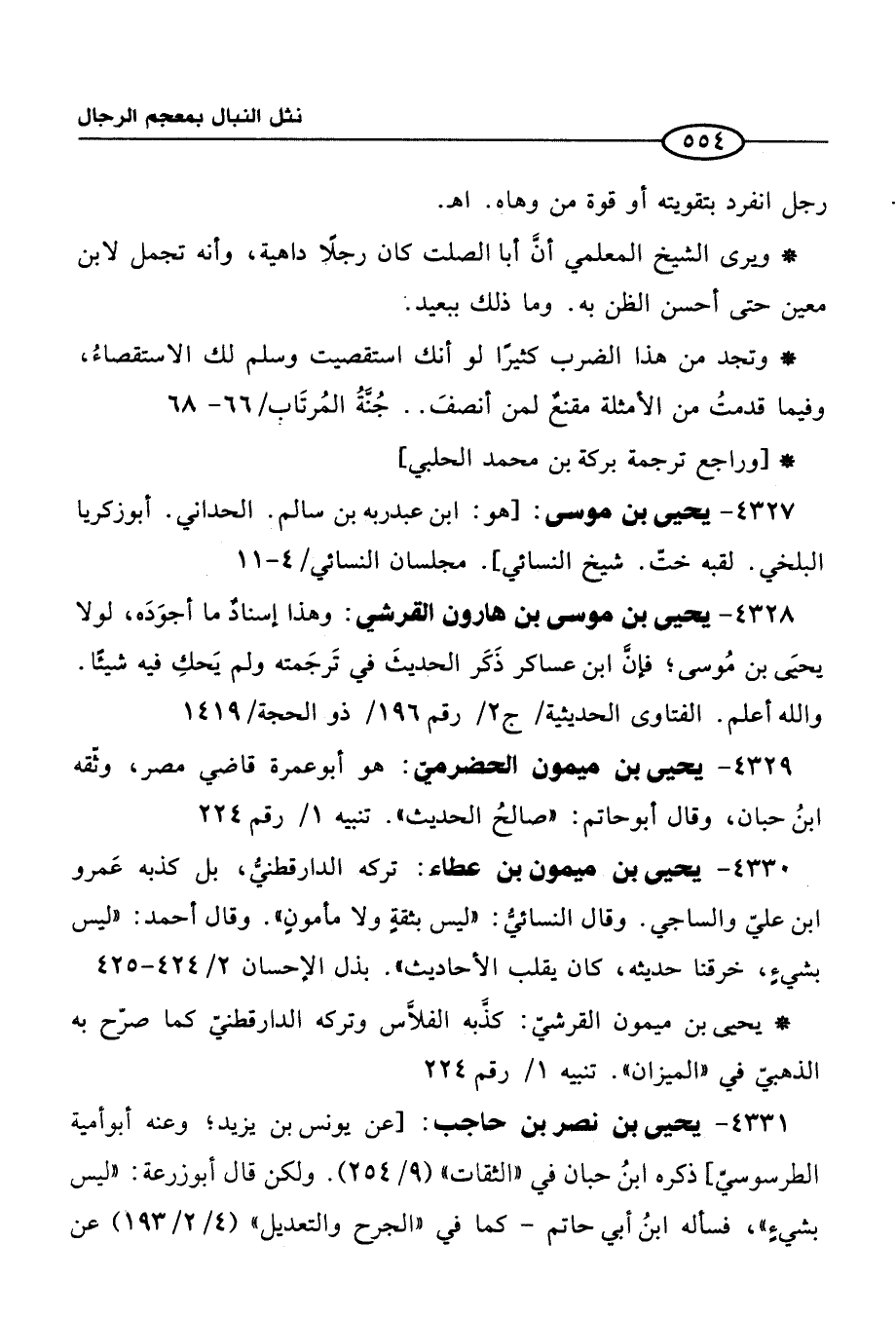 4329 - يحيى بن ميمون الحضرميّ: هو أبو عمرة قاضي مصر، وثّقه ابنُ حبان، وقال أبو حاتم: "صالحُ الحديث". تنبيه 1/ رقم 224