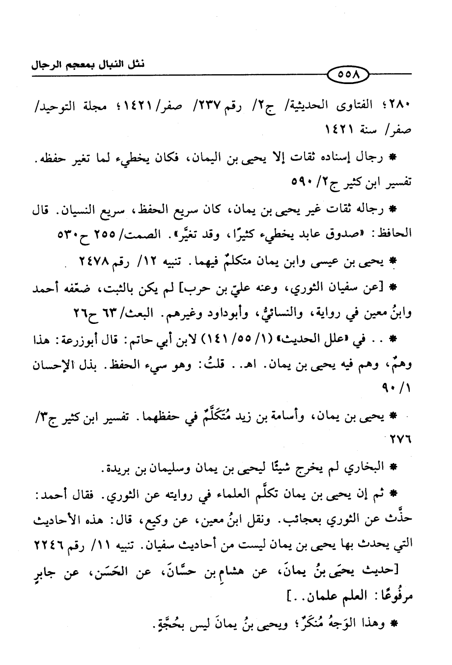 * ثم إن يحيى بن يمان تكلَّم العلماء في روايته عن الثوري. فقال أحمد: حدَّث عن الثوري بعجائب. ونقل ابنُ معين، عن وكيع، قال: هذه الأحاديث التي يحدث بها يحيى بن يمان ليست من أحاديث سفيان. تنبيه 11/ رقم 2246