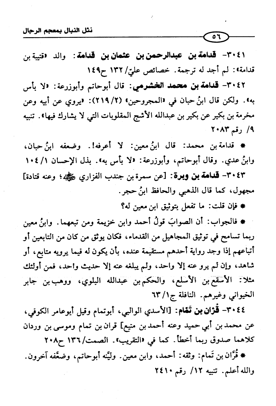 3041 - قدامة بن عبد الرحمن بن عثمان بن قدامة: والد "قتيبة بن قدامة": لم أجد له ترجمة. خصائص عليّ /132 ح 149