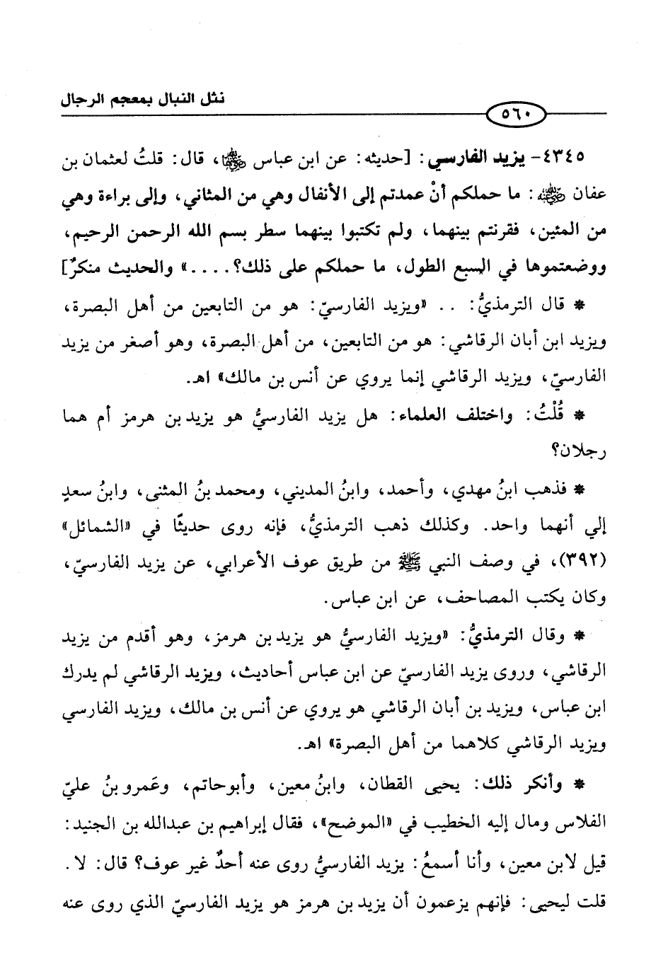 4345 - يزيد الفارسي: [حديثه: عن ابن عباس رضي الله عنهما، قال: قلتُ لعثمان بن عفان -رَضِيَ الله عَنْهُ-: ما حملكم أنْ عمدتم إلي الأنفال وهي من المثاني، وإلى براءة وهي من المئين، فقرنتم بينهما، ولم تكتبوا بينهما سطر بسم الله الرحمن الرحيم، ووضعتموها في السبع الطول، ما حملكم على ذلك؟. . . . " والحديث منكرٌ]